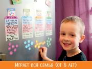 Часть комплектующих игры выполнена на основе магнитного винила: игровые планшеты и жетоны очков. Это позволяет держать список дел и заработанные очки на холодильнике, чтобы они чаще попадались на глаза. Это важно и для мотивации игроков.